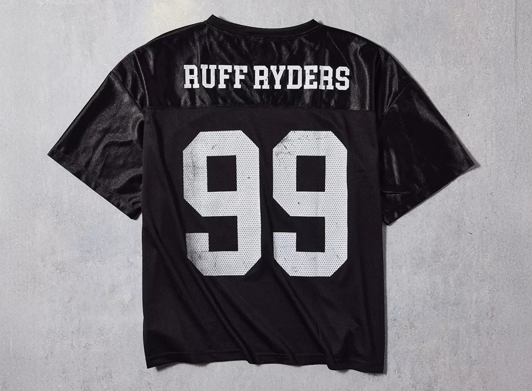 Ruff Ryders graphic print football jersey. V-neck style short sleeve tee with a poly mesh fabrication and classic athleticwear look.